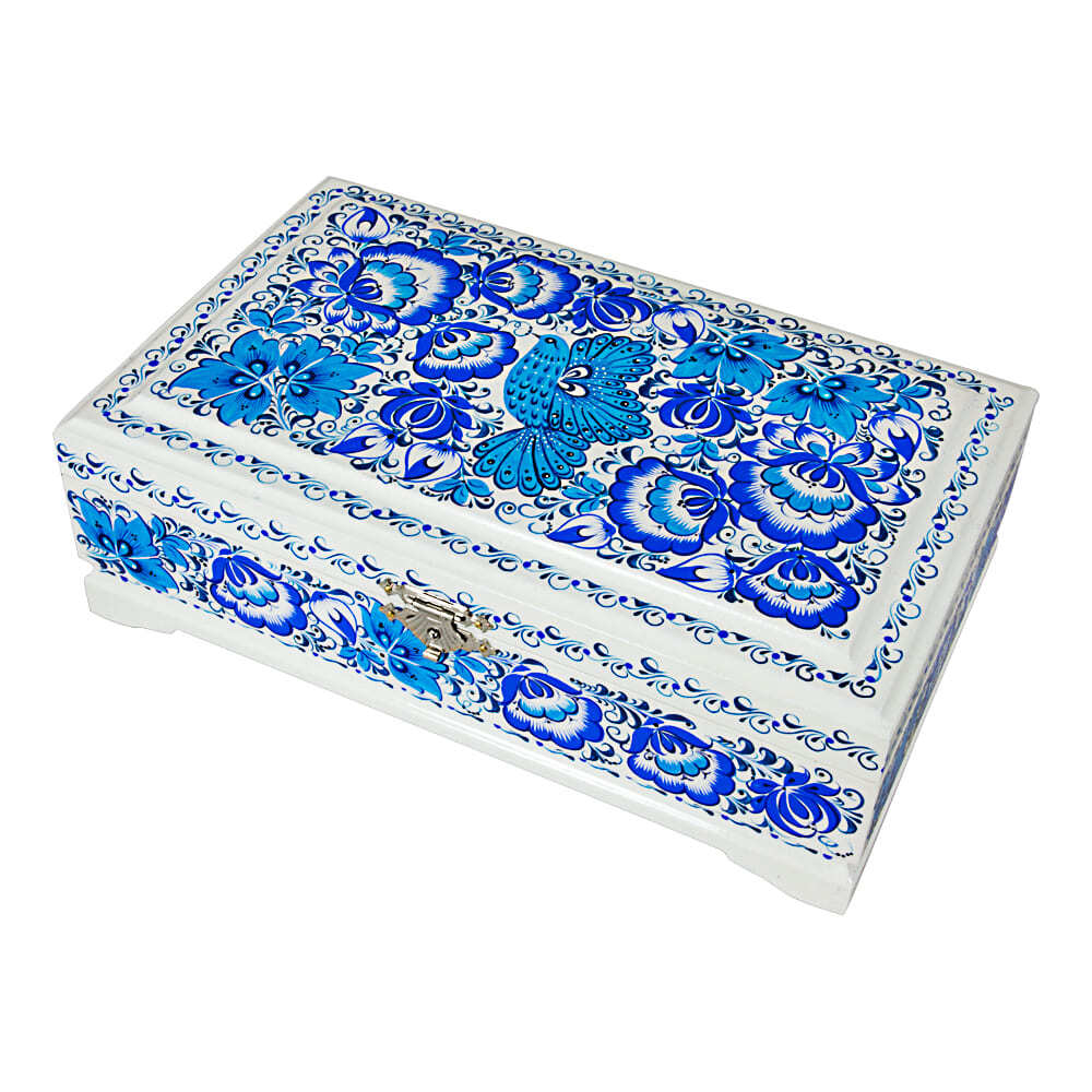Шкатулка с бело-голубой росписью Птицы и цветы — арт. ШДР-030